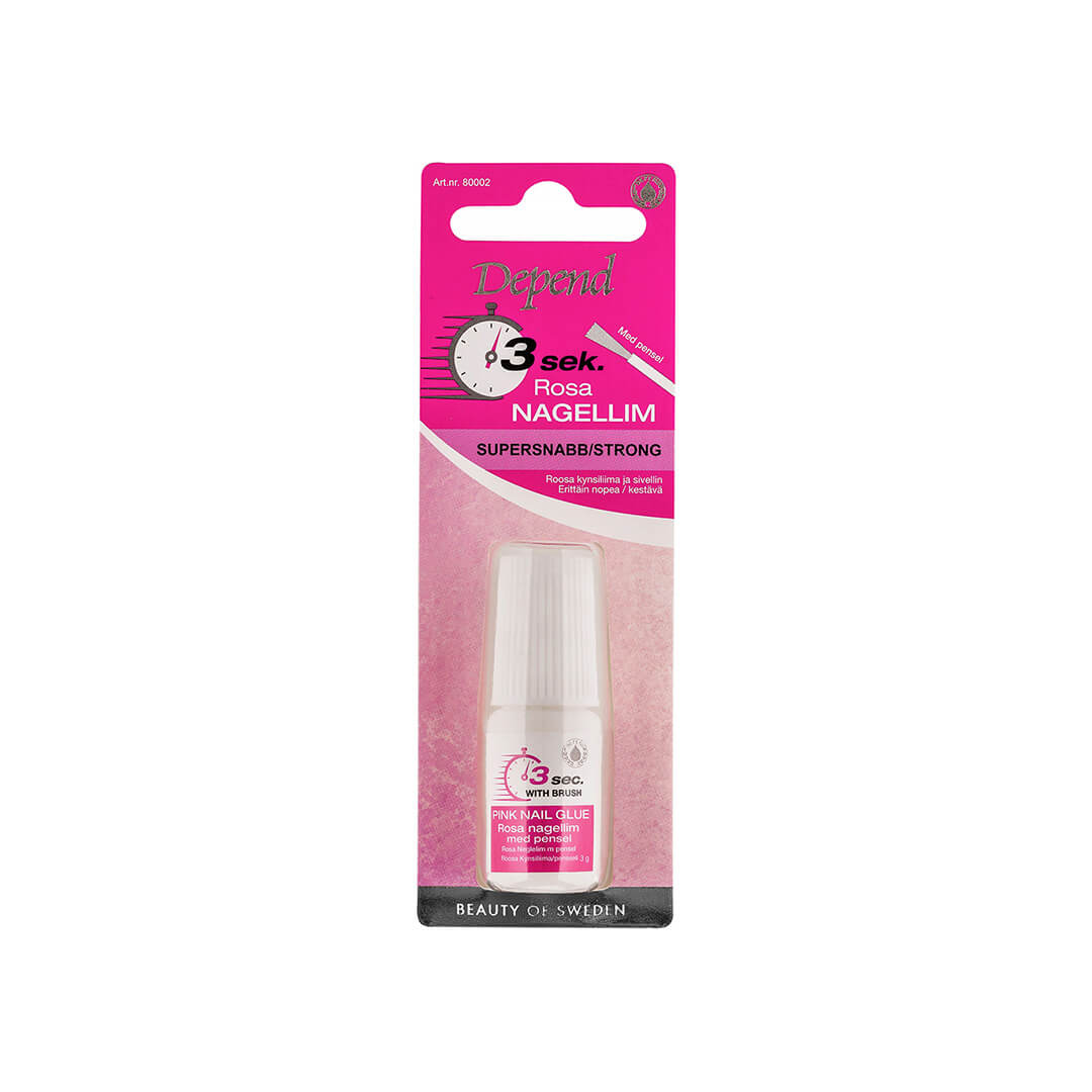 Rosa nagellim för applicering av lösnaglar och nageltippar. Fäster på bara 3 sekunder. Den rosa färgen tar upp naglarnas naturliga utseende. Vid borttagning använd Depend Lösnagelremover.