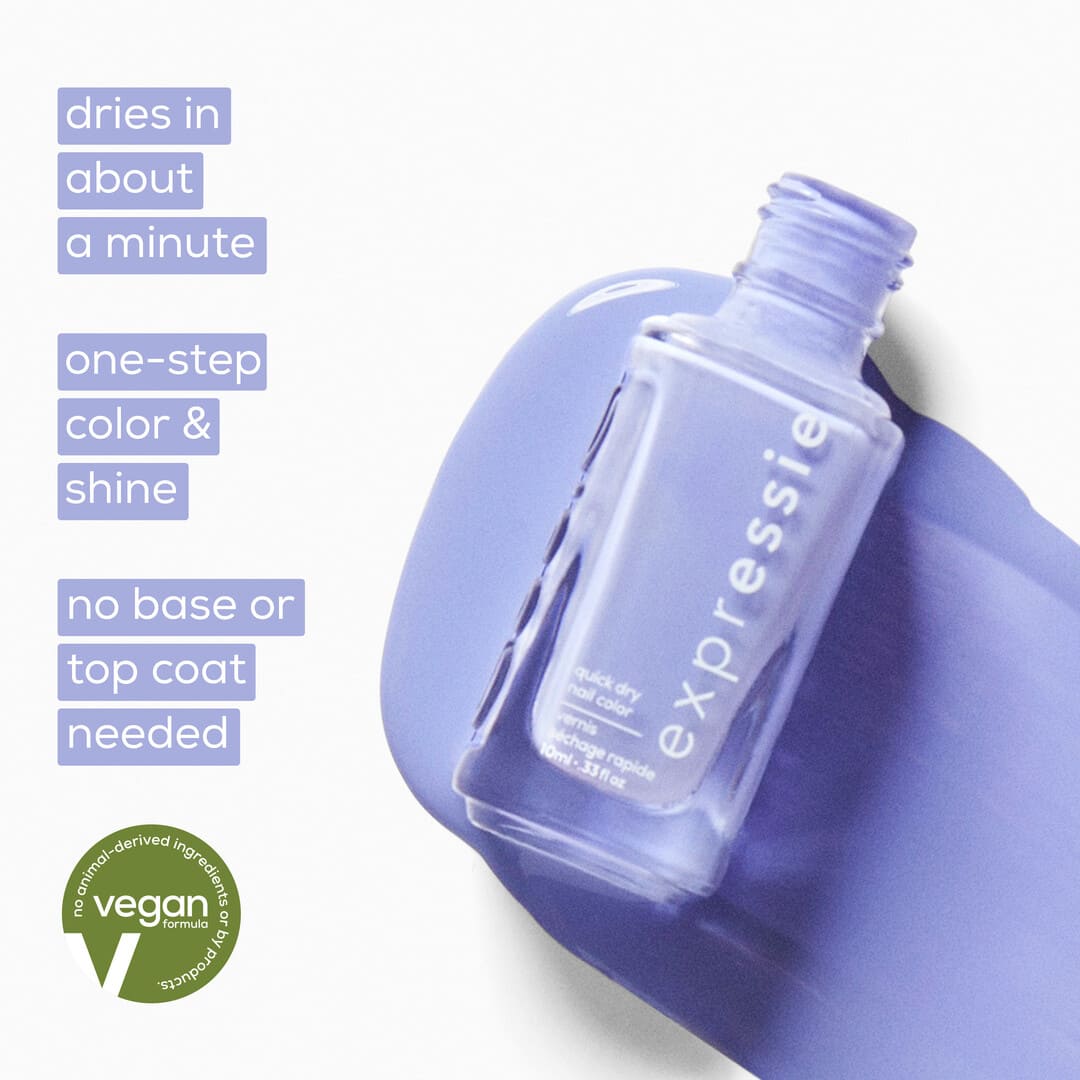 essie Expressie Nail Polish ger färg och glans i ett steg som torkar på ca en minut. Börja med att grundligt rengöra naglarna med nagellacksborttagning för att få bort smuts och fett. Applicera 2 lager av ditt snabbtorkande favorit-Expressie Nail Polish och låt torka ca 1 minut.