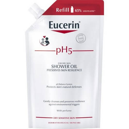 Du har torr, känslig hud eller lider av typ 1-allergier. Eucerin pH5 Shower Oil rengör försiktigt torr, känslig hud, skyddar dess naturliga barriär och gör den mer motståndskraftig mot miljöfaktorer. Passar även allergistressad hud.