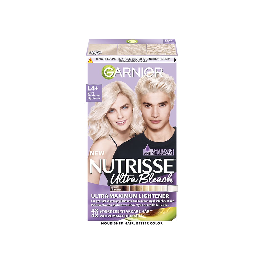 Upptäck den nya innovativa formulan från Garnier Nutrisse Ultra Bleach L4+ Ultra Maximum Lightener. Tack vare vår innovativa oljeberikade blonderingsteknologi kan du bleka håret upp till 9 toner för vår ljusaste och klaraste blonda nyans.