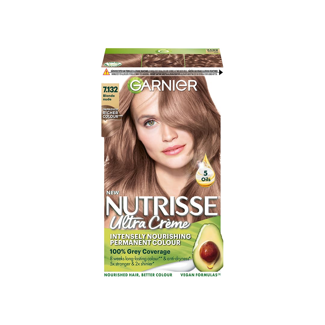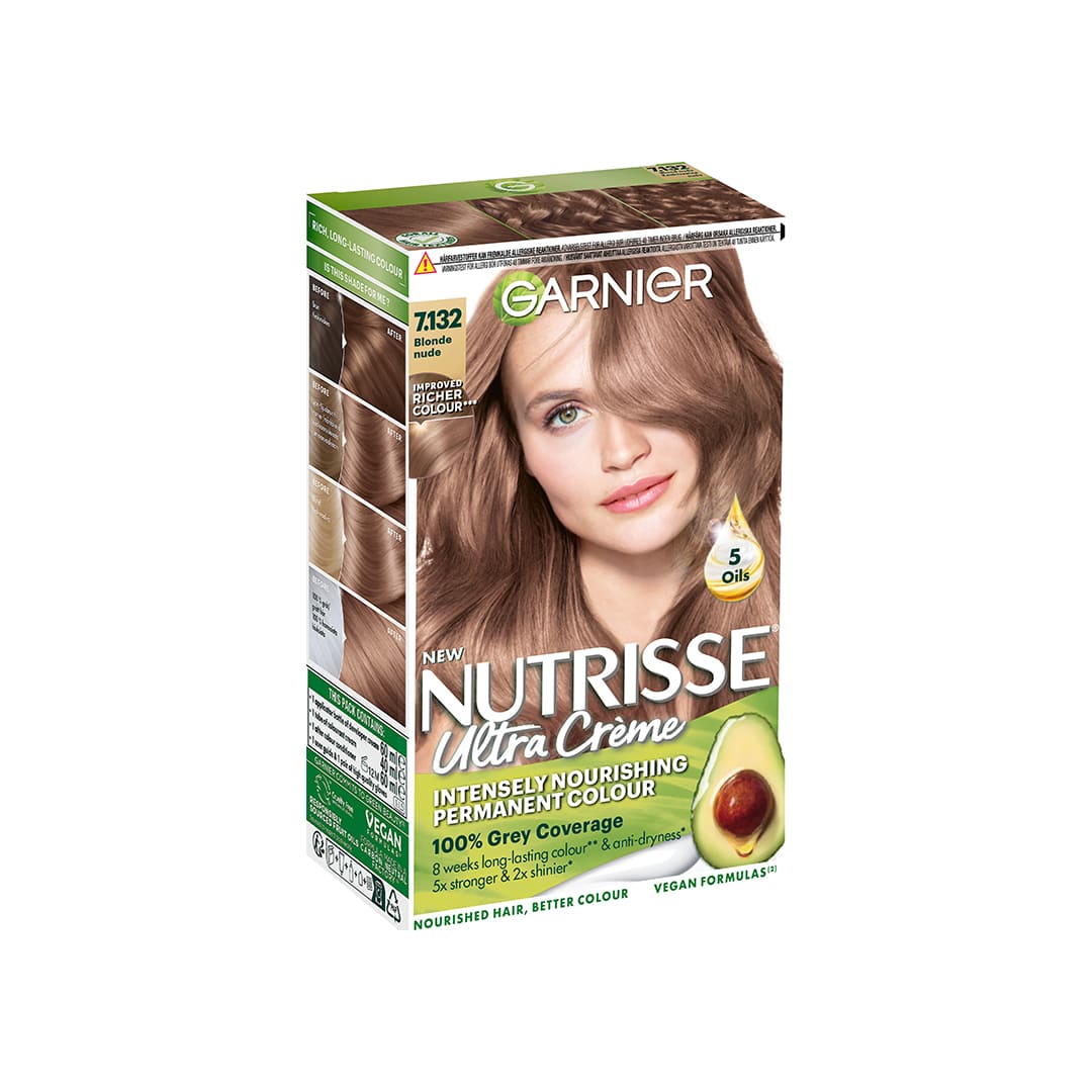 Garnier Nutrisse Ultra Crème 7.132 Blond Nude är en intensivt närande permanent hårfärg. Ger ett fylligt, varaktigt färgresultat och 100 % gråhårstäckning. Formula berikad med 5 oljor för intensiv näring. Ger ett 5X starkare och 2X blankare hår**