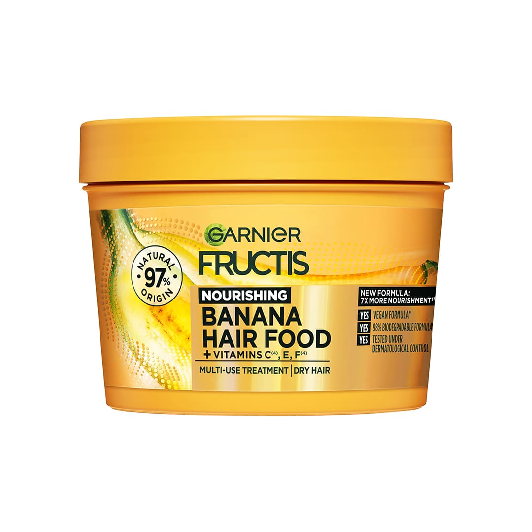 Garnier Fructis Hair Food Banana Multi-use Treatment är en hårmask för torrt hår som ger intensiv näring, lätt att reda ur och gör det lent. Resultatet? 7X mer närt hår*! Vegansk formula** berikad med omega 6 och 9, vitamin C+F-derivater samt E-vitamin.