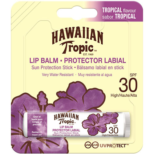 Finns i SPF 45 Hawaiian Tropic® Tropical Lip Balm är ett utmärkt sätt att skydda dina läppar. Det bidrar till fukt och skyddar din hud mot UVA och UVB strålar. Dessutom är det bra att använda på de ofta glömda fläckarna som näsan, öronen och kinderna. Resultat • Hjälper till att minska dina chanser att läpparna spricker, blåsor och solbränna • Läcker tropisk smak Specifikation • Lättvikt och icke vaxartat • Gjord med Aloe Vera, Kakaosmör och Vitaminer A, C & E • Vattentålig i upp till 80 minuter