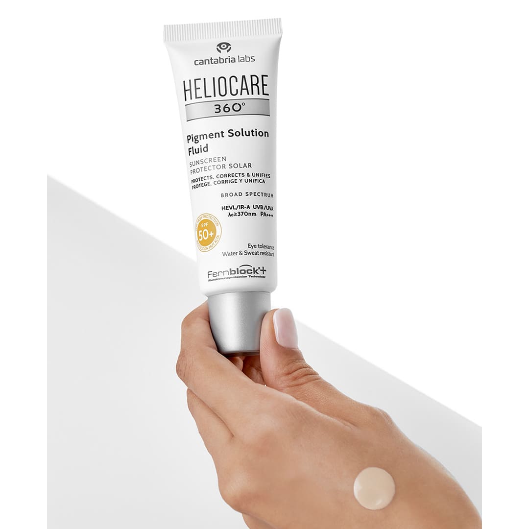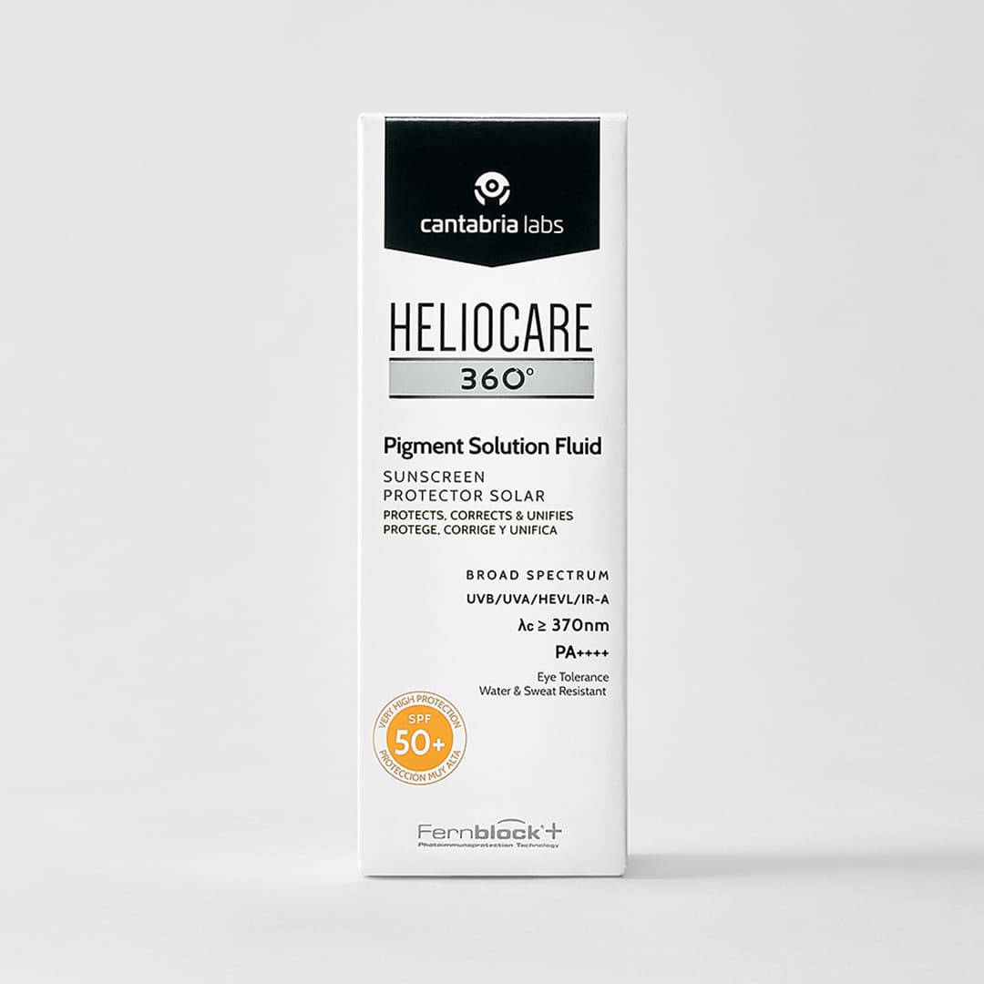 Denna verksamma fluid bidrar till en jämnare hudton och förebygger nya pigmentfläckar. Sammansättningen består av den av Heliocare patenterade antioxidanten Fernblock som tillsammans med flera andra verksamma antioxidanter samt niacinamid som effektivt minimerar befintliga pigmentfläckar och hämmar uppkomsten av nya. Ger ett komplett skydd mot skadliga effekter av UVA- och UVB-strålning, synligt ljus (HEV) och infraröd strålning (IR). Sammansättningen bidrar även till att reparera solskador. Passar alla hudtyper. Icke-komedogen. Vattenresistent.