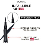 Infaillible bold lines all day, every day! L'Oréal Paris Infaillible Grip 24H Precision Felt eyeliner har en tunn filtspets på 0,4 mm* så att du kan skapa exakta linjer som håller i upp till 24 timmar**. Design som ger bra grepp för kontrollerad och enkel applicering. Vattenfast formula.