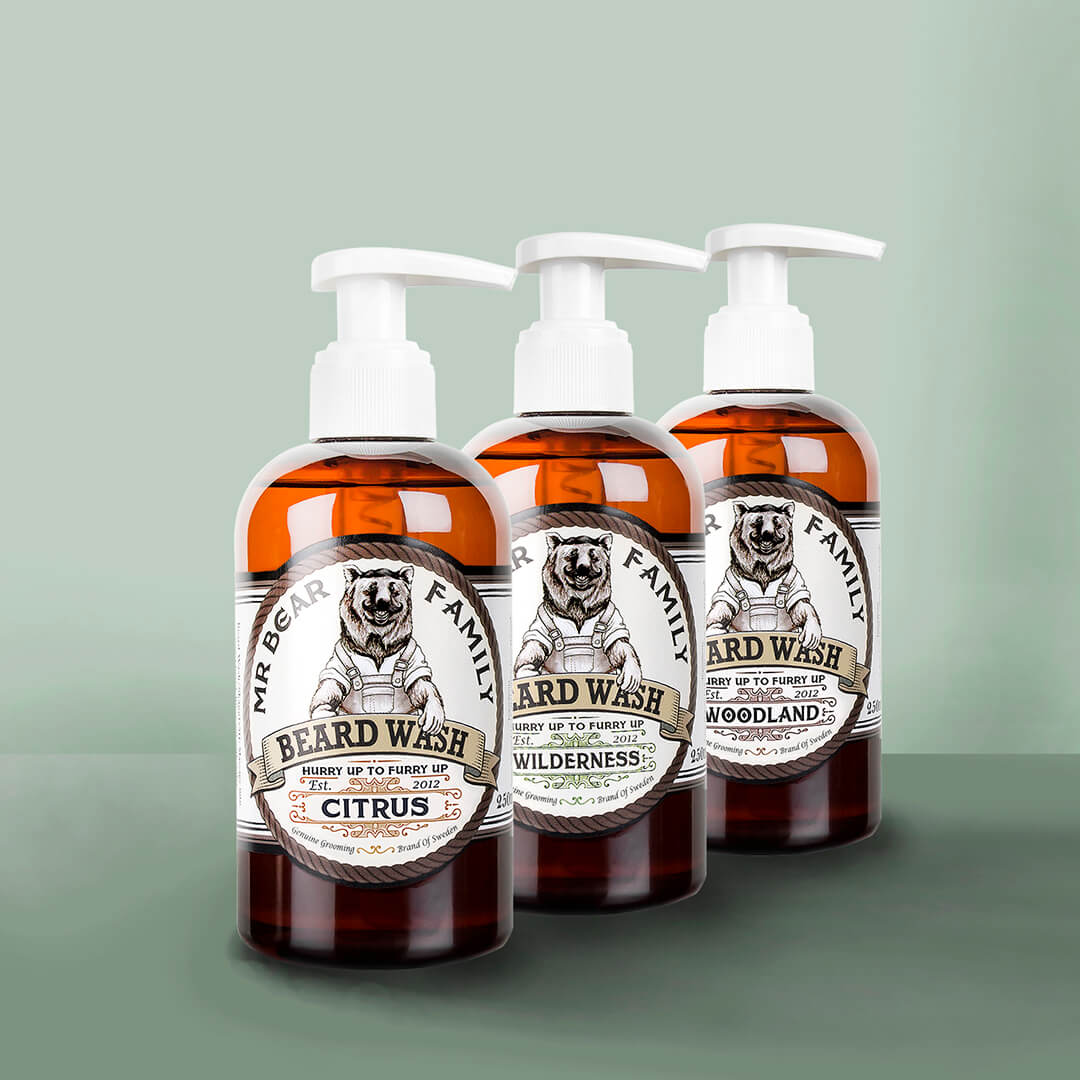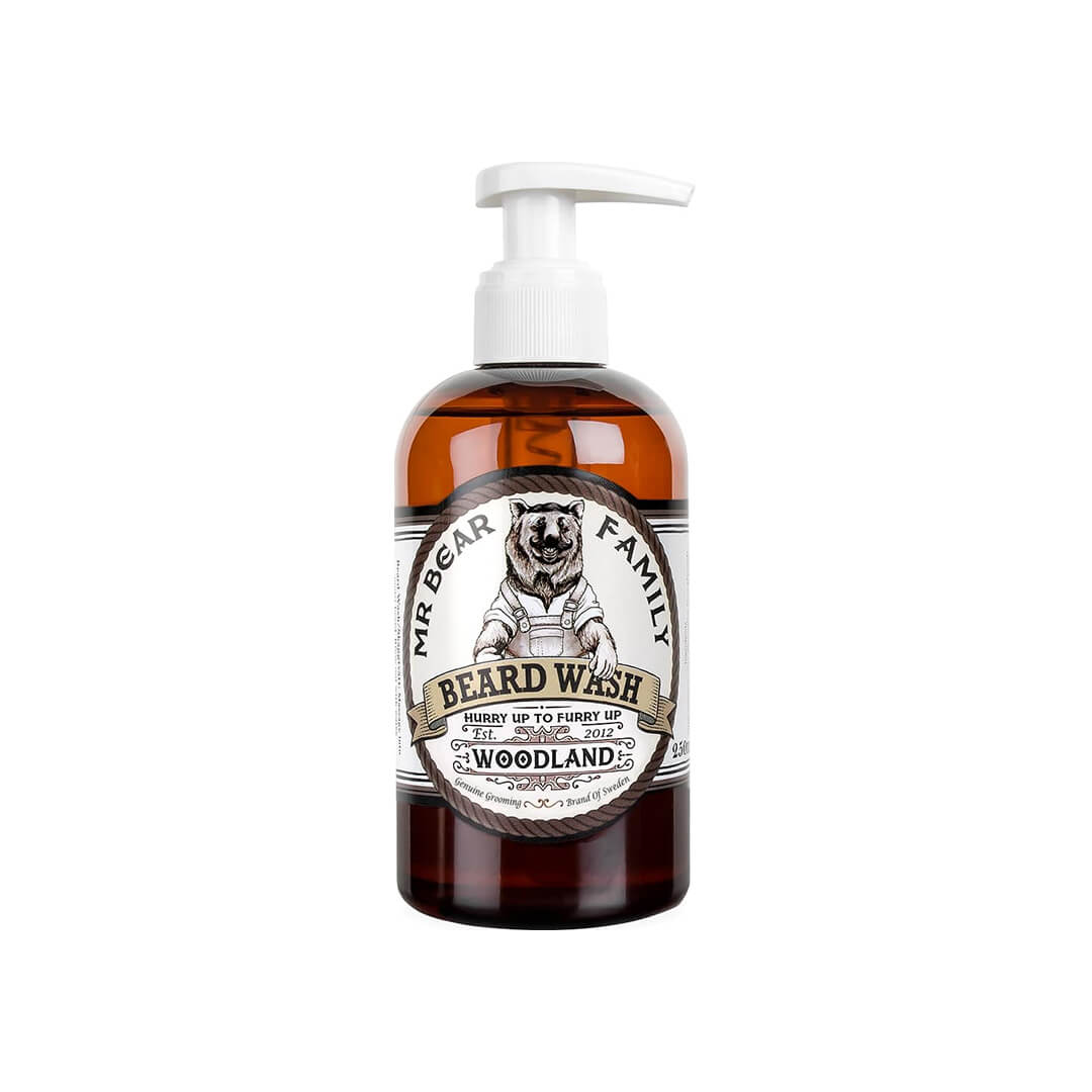 Beard Wash Woodland (250 ml) En mild skägg tvätt baserad på tensider av vegetabiliskt ursprung. Lugnande för irriterad hud, mjukgörande, med anti-inflammatoriska egenskaper. Vårdar skägget med en frisk och fräsch känsla. Beard Wash Woodland har en härlig doft av grönskande barrskog. Används med fördel tillsammans med Mr Bear Family Beard Brew och Beard Balm. Applicering: Pumpa ut en lagom mängd tvål i handflatan. Massera in i fuktigt skägg. Skölj ur med varmt vatten.