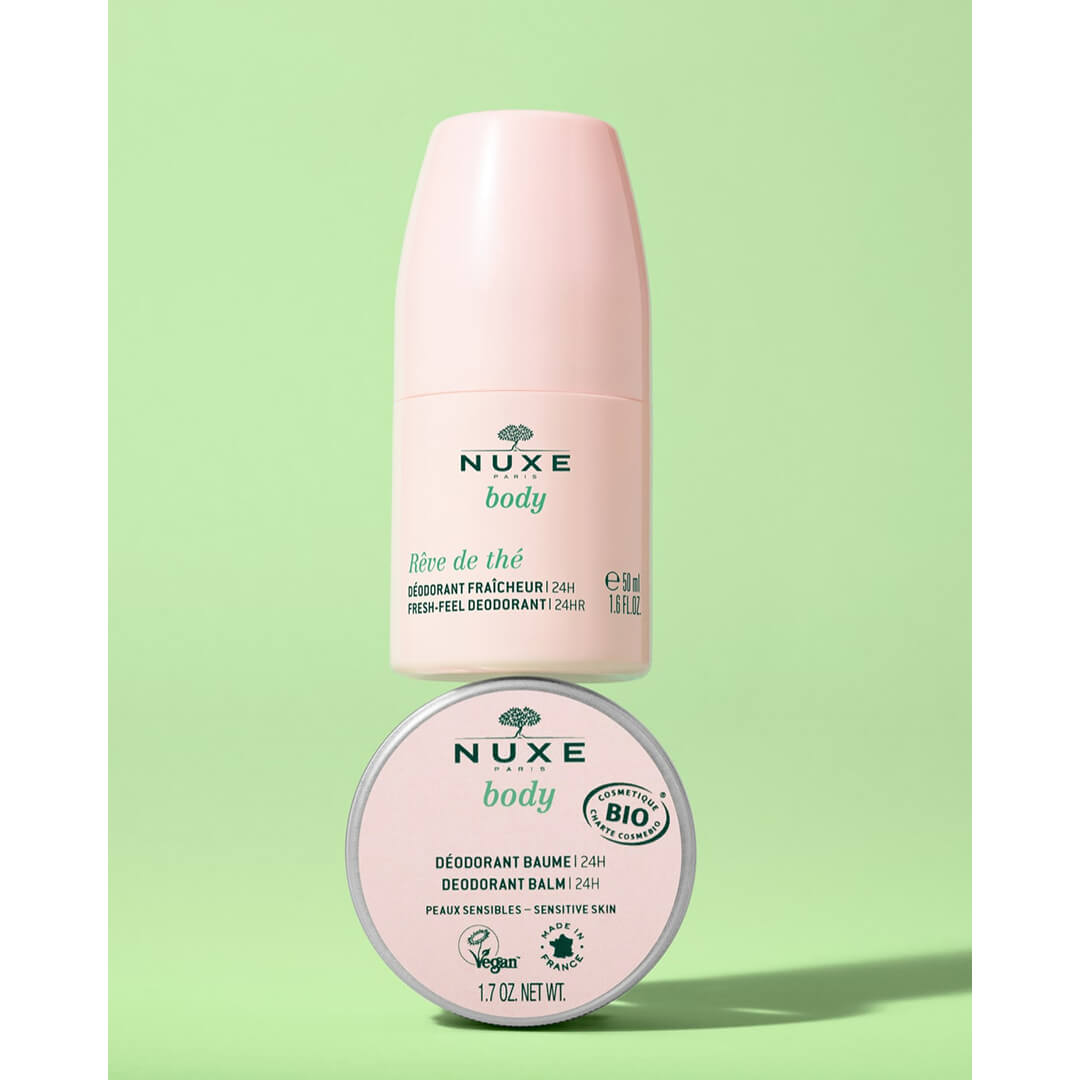Body Sensitive Skin Deodorant Balm från NUXE är särskilt framtagen för känslig hud och kombinerar 24 timmars* effektivitet med hudvårdande egenskaper. Formulan innehåller absorberande, botaniskt puder och ekologisk, botanisk olja. Den pudriga balmtexturen ger en torr finish och appliceras enkelt med fingertopparna, och huden omfamnas med näring och komfort. Deodoranten har en lugnande doft av söt apelsinblomma. Lämnar inga ränder på kläderna. 100% naturliga ingredienser.
