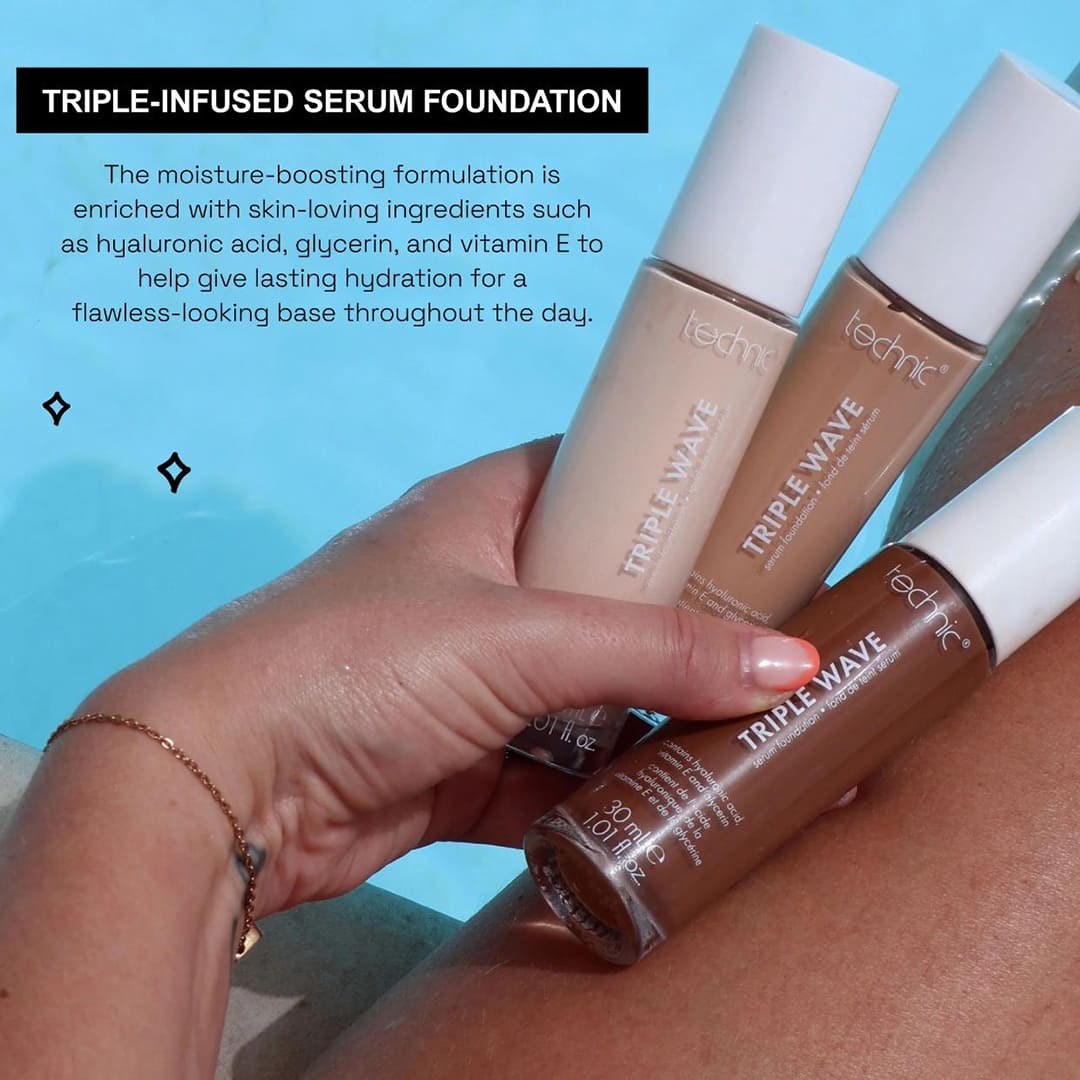 Triple Wave är en foundation som kombinerar hudvård och makeup, designad för att smälta in i huden och hjälpa till att täcka ojämn hudton och fläckar.