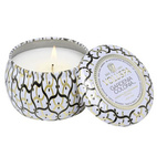 Voluspa Maison Blanc Mini Tin Candle är doftljus av krämig kokosvaxblandning som gör att ljuset utsöndrar en mycket kraftfull och generös doft. Dessutom gör kokosvaxet att ljuset brinner med en klar låga och ger doftljuset en lång brinntid. Veken är av 100 % bomull. Ljusen tillverkas och tappas för hand i egen fabrik i Kalifornien. Detta ljus har en brinntid på 25 h och en doft av gardenia och vilda vita blommor som silkeslen sammet.