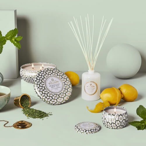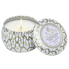 Voluspa Maison Blanc Mini Tin Candle är doftljus av krämig kokosvaxblandning som gör att ljuset utsöndrar en mycket kraftfull och generös doft. Dessutom gör kokosvaxet att ljuset brinner med en klar låga och ger doftljuset en lång brinntid. Veken är av 100 % bomull. Ljusen tillverkas och tappas för hand i egen fabrik i Kalifornien. Detta ljus har en brinntid på 25 h och en doft av grönt te, mynta och citronskal.